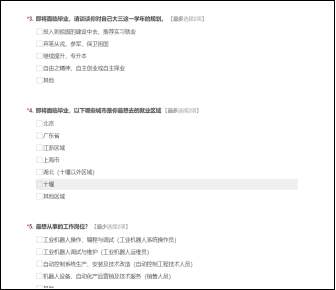 调查问卷内容包含“你对自己大三学年的规划、你期望的就业区域、你期望的就业岗位、你期望的实习薪资”等调查问题。